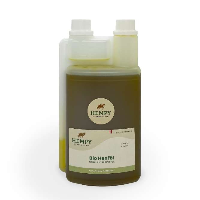 Auf dem Bild sieht man die 1 Liter Flasche von dem Bio Hanföl von Hempy