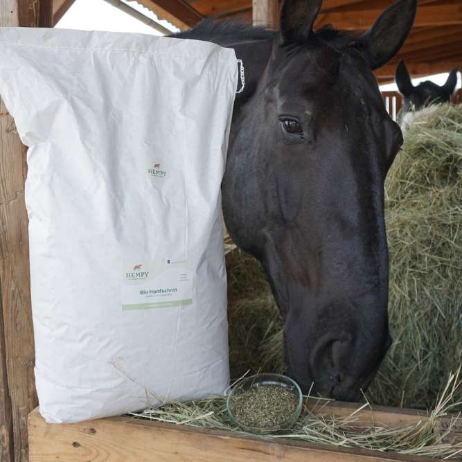Pferde ca. eine Woche mit 20 bis 30 g Hanfschrot pro Tag anfüttern. Danach bei Großpferden 50 bis 60 g, bei Kleinpferden und Ponys 30 bis 40 g täglich (je 100 Kilo Körpergewicht ca. 10 – 20 g).